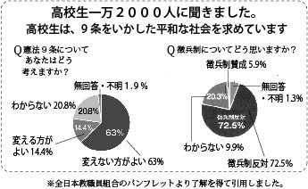 日本高等学校教職員組合が昨年一一月に全国の高校生一万人以上に対して、日本国憲法や現代社会に対して、どのような意識を持っているか調査をして、その結果が五月三日新聞紙上で発表されました。九条に対しては四年前に比べて「変えない方が良い」が二%増加して六三%になりました。 この調査で、愛知の女子高校生は「世界中の戦争をやめて、今現在使われている、これから使われる予定である軍事費をすべて、貧しくて学校・病院に行けない人達がいる国、児童労働をしている国などいろいろな面でお金を必要としている国などに与えるべきだと思います。今から一〇年の間に、全部が実現したり、すべての戦争・紛争がなくなることは可能性が低いと思いますが、もし先に述べた事がすべて実現したら、世界は平和になり、豊かになると思います」とアンケート用紙に書いています。